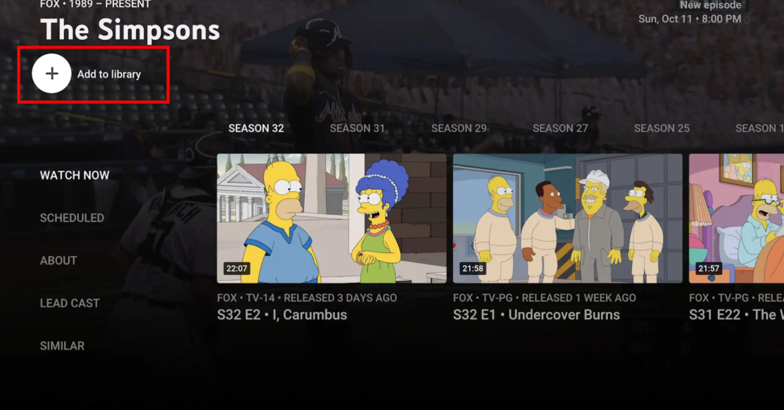 Roku、Fire TV、Apple TV、またはその他のサポートされているデバイスで YouTube TV を開きます。番組を検索して詳細ページを開きます。シリーズ全体を録画するには、[ライブラリに追加] を選択します。