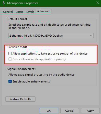 これでミュートを解除する必要がありますが、頻繁に発生しないようにするには、[詳細strong>] タブに移動します。 [排他モード] セクション内のチェックボックスをオフにして、アプリケーションからマイク コントロールを無効にします。