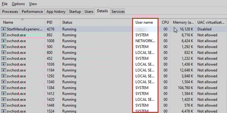 svchost.exe を確認してください プロセスとそれに対応する ユーザー名。システム、ローカル システム、またはコンピューターの名前と異なる場合は、潜在的なマルウェアである可能性があります。