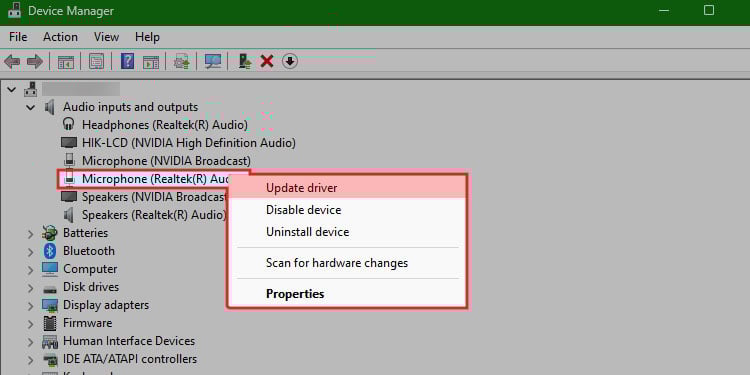 ダブルクリックして オーディオ入力と出力 を展開します。マイク ドライバを右クリックして、[ドライバの更新] を選択します。