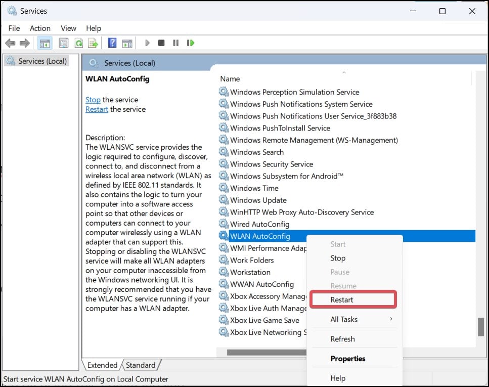 Windows キー + R を押し、「servies.msc」と入力して Enter キーを押します。サービスで、WLAN AutoConfig という名前の Windows サービスを見つけます。 右クリックして 再起動<を選択します/強い>。 [再起動] オプションが利用できない場合は、[開始] オプションを選択します。
