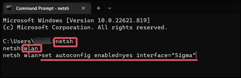 netsh と入力して Enter キーを押します。ここで、WLAN と入力して Enter キーを押します。最後に、このコマンド ラインを使用して WLAN Autoconfig サービスを開始します。