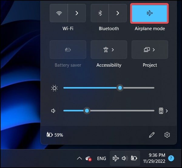 システム トレイの Wi-fi アイコンをクリックします。機内モードがオフになっていることを確認します。有効になっている場合は、クリックしてオフにします。