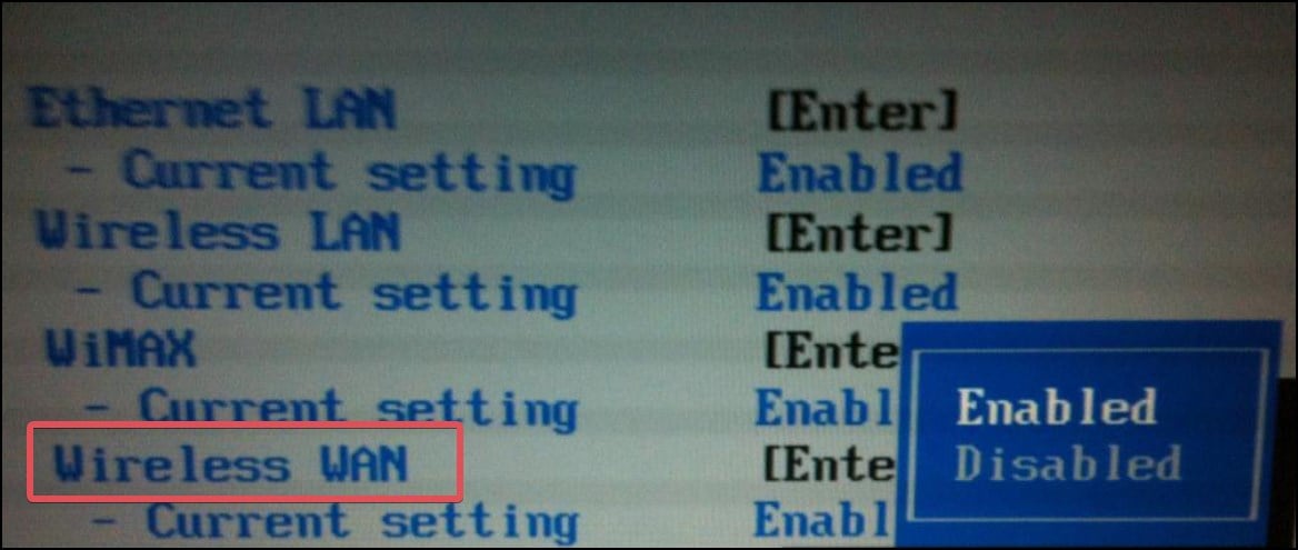 コンピューターを再起動して、BIOS に入ります。 構成または 詳細セクション に移動します。 WLAN デバイス オプションに移動します。このオプションは、Lenovo デバイスの一部のモデルでは、ワイヤレス デバイスとして名前を付けることができます。オプションを有効に設定します。