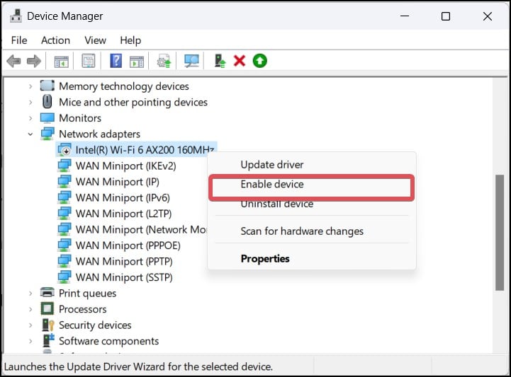 Windows キー + X を押して、デバイス マネージャーを開きます。 ネットワーク アダプタ セクションに移動し、Wi-Fi アダプタを右クリックします。 [デバイスを有効にする] オプションをクリックして、デバイスを閉じます。マネジャー。