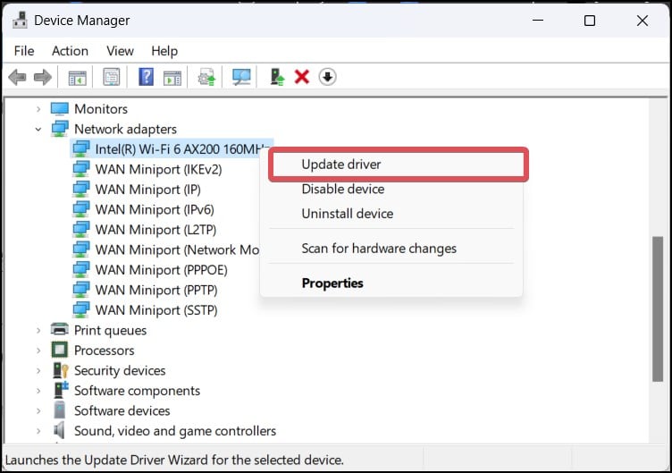 Windows キー + X を押して、デバイス マネージャー を開きます。 [ネットワーク アダプタ] の下で、Wi-Fi ドライバを選択して右クリックします。 [ドライバーの更新] を選択します。