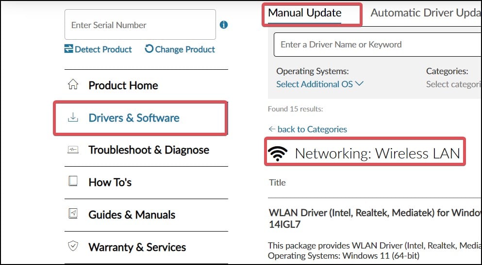 Lenovo サポート Web サイトにアクセスします。所有している Lenovo デバイスをリストから選択します。また、デバイス モデルを自動的に検出するオプションもあります。お使いのデバイスの専用ページにアクセスしたら、[ドライバーとソフトウェア] セクションに移動します。 [手動更新] タブをクリックします。 ネットワーキング: ワイヤレス WAN ドライバを見つけてダウンロードします。実行可能ファイルを実行し、Wi-Fi ドライバーをインストールします。