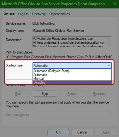 Services アプリを介して Click-to-Run を無効にする