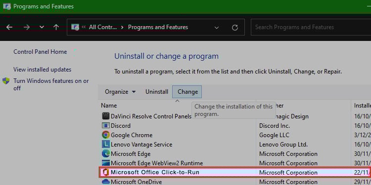 次に、[プログラムと機能] を選択し、Microsoft Office Suite を見つけます。リストから。