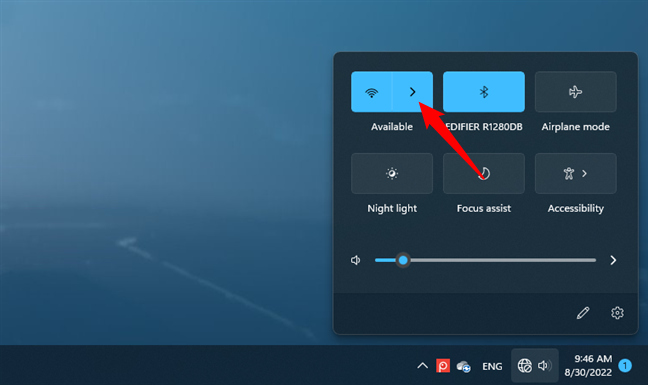 この操作により、クイック設定フライアウトが開きます。ボタンがオンになっているかどうかを確認して、Wi-Fiが有効になっていることを確認します。次に、横にあるキャレット (>) ボタンを押します。