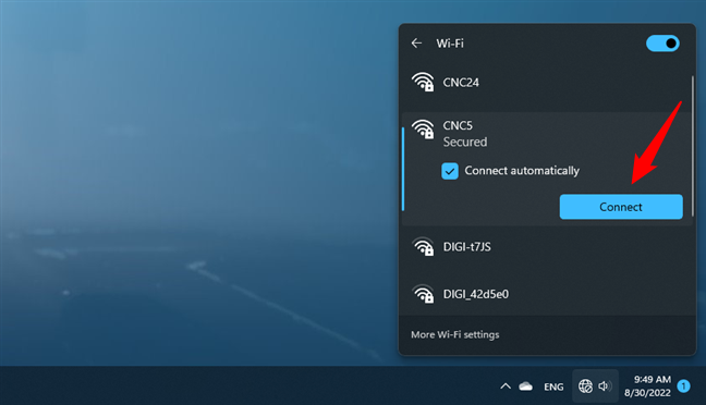 Windows 11 は、お住まいの地域で利用可能なすべての Wi-Fi ネットワークを一覧表示します。 WPS を使用して接続したいものを特定し、その名前をクリックまたはタップします。定期的に使用するネットワークの場合は、そのボックスにチェックを入れて [自動的に接続] オプションを有効にすることをお勧めします。次に、[接続] を押します。
