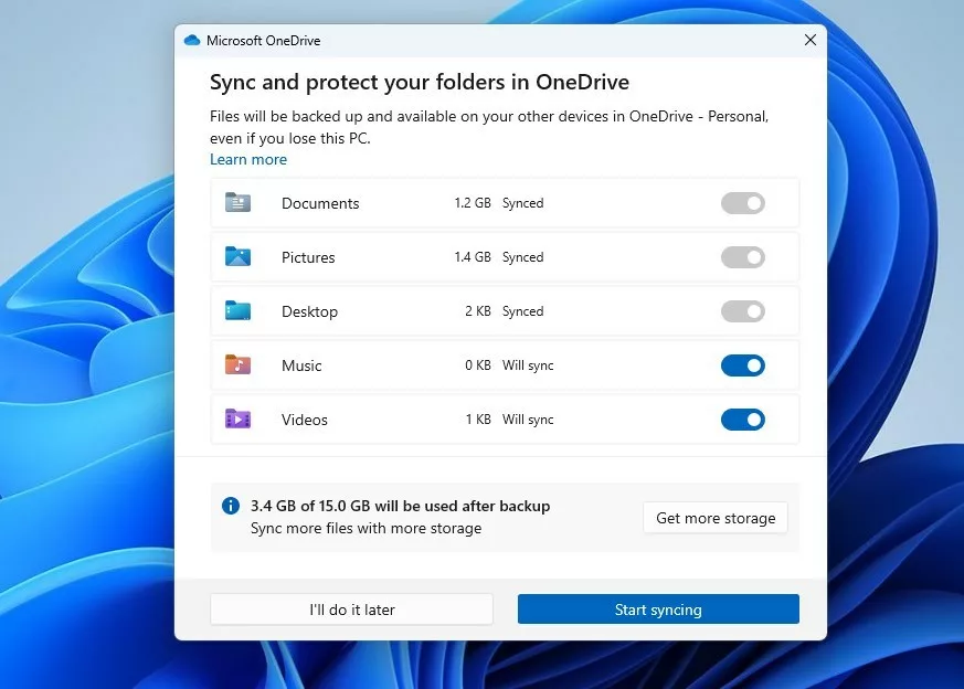 次のウィンドウで、OneDrive アカウントにバックアップするフォルダーを選択します。既存のフォルダとコンテンツは自動的にクラウドにバックアップされます。