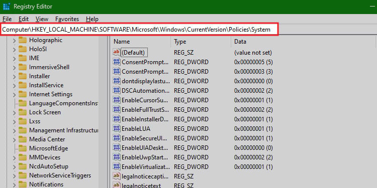 [はい] をクリックします。次のパスをパス セクション HKEY_LOCAL_MACHINE\SOFTWARE\Microsoft\Windows\CurrentVersion\Policies\System\