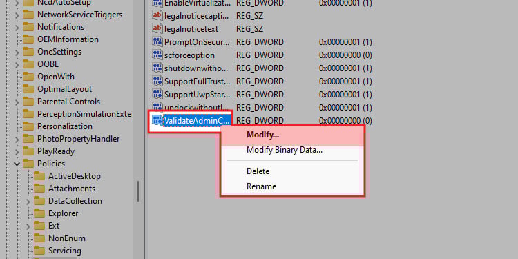 ValidateAdminCodeSignature を右クリックし、変更 を選択します。