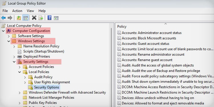 ローカル ポリシーをクリックします。 [セキュリティ オプション] をクリックします。