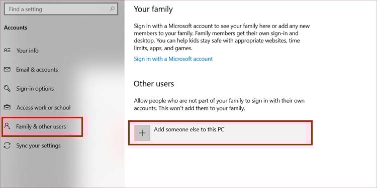 左パネルから [家族とその他のユーザー] を選択します。 [他のユーザー] の下の [この PC に他のユーザーを追加する] をクリックします。