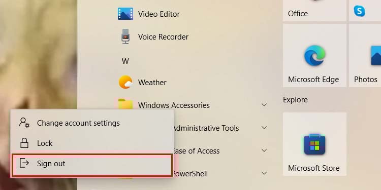 スタートを開きます。ユーザー アカウントをクリックし、[サインアウト] を選択します。