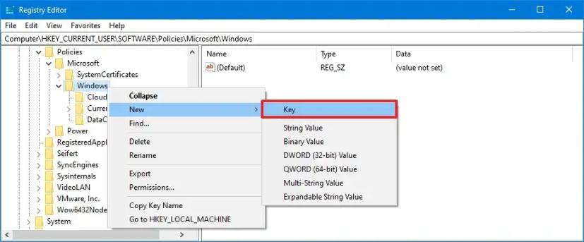 Windows フォルダーを右クリックし、New サブメニューを開き、Key をクリックします。