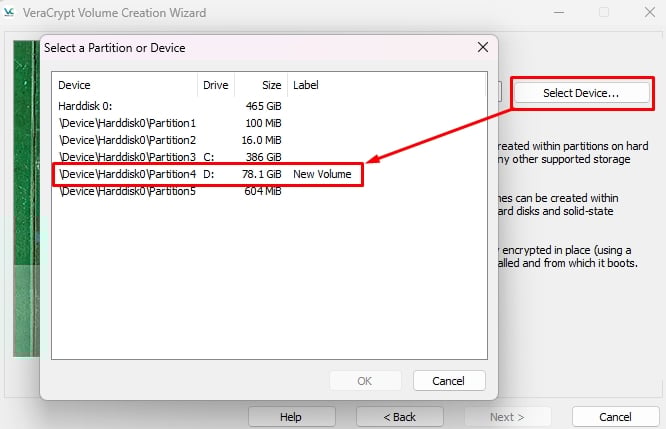 標準 VeraCrypt ボリューム または非表示 VeraCrypt ボリュームをそこに記載されている情報を読んで選択します。ボリュームを選択するには、[デバイスの選択] をクリックして、保護するそれぞれのパーティションを選択します。