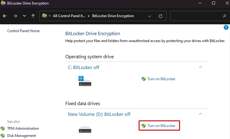 ドライブのコンテキスト メニューに [BitLocker を有効にする] 機能が見つからない場合 (以前の Windows バージョンの場合)、コントロール パネルからこれを行うことができます。