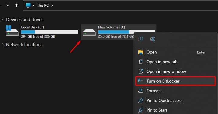 開く Windows +’E’を押して、Windows エクスプローラーに移動します。 [この PC またはコンピュータ] をクリックして、システム上のドライブを一覧表示します。ドライブを右クリックし、[BitLocker を有効にする] を選択します。