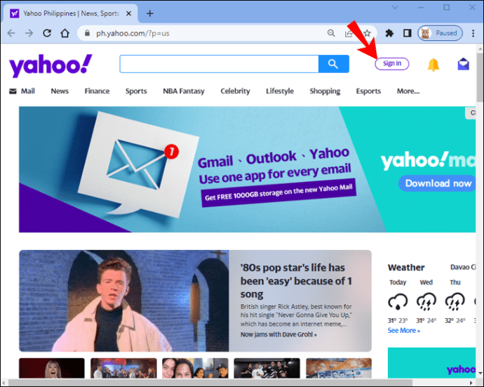 Yahoo にアクセスし、右上隅にあるサインイン ボタンをクリックします。