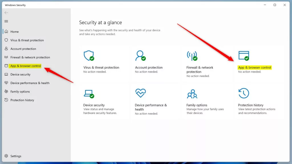 Windows セキュリティ アプリが開いたら、 アプリとブラウザの制御セクション。