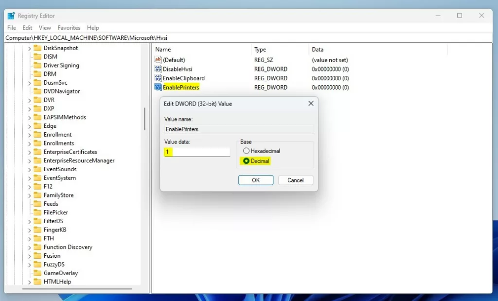 Hvsi フォルダ キーの右側のペインで、右クリックして選択 New-> DWORD (32 ビット) 値。 EnablePrinters という名前の新しいキーを入力します。