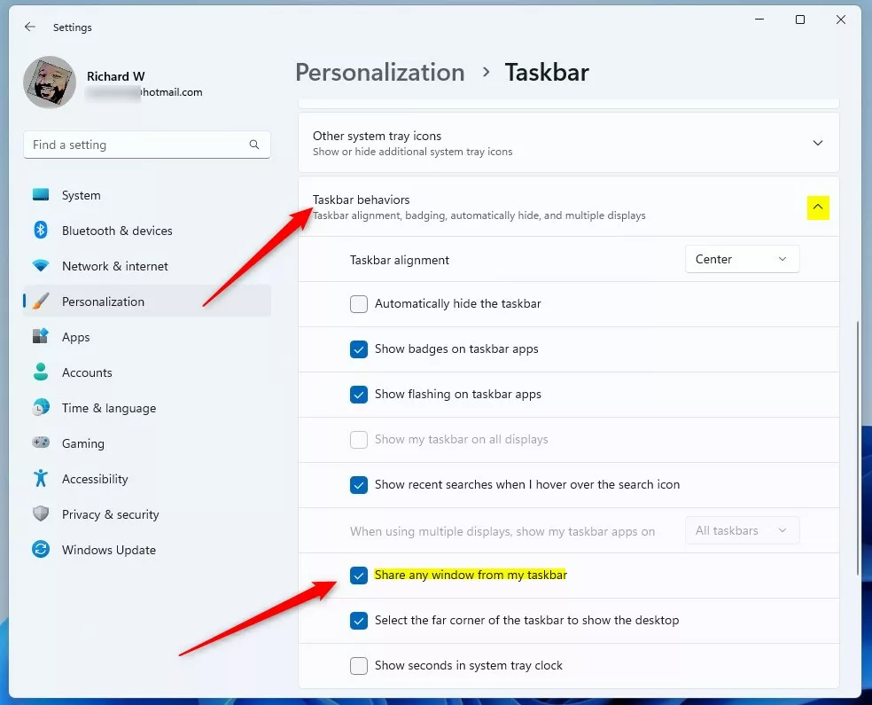 System-> Taskbar 設定ペインで、Taskbar behavior タイルを選択して展開します。展開されたタスクバーの動作タイルで、[タスクバーから任意のウィンドウを共有] の横にあるチェックボックスをオンにして有効にします。