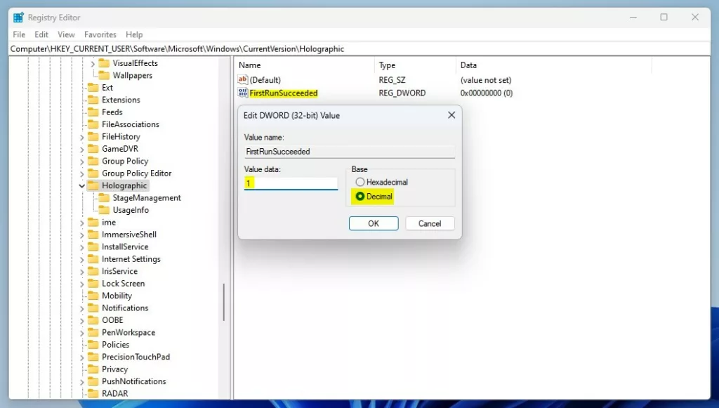 新しい値の名前 (FirstRunSucceeded) をダブルクリックし、値のデータ を入力します。 of 1 の Mixed Reality ボタンを設定アプリに追加または表示します。