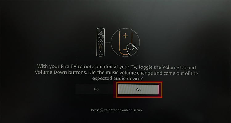 プロンプトに従って、音量アップとダウンを押します ボタン。リモコンで音量を制御する場合は、[はい] を選択します。そうでない場合は、[いいえ] オプションを選択してください。音量が調整されるまで、この手順を繰り返します。