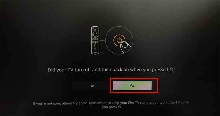 Fire TV の電源ボタンを押すように求められます。. 10 秒後に同じボタンを使用してテレビの電源を入れます。 [はい] を選択して、テレビの電源が切れたかどうかを確認します。テレビの電源が切れなかった場合は、[いいえ] を選択して、この手順を 11 回まで繰り返します。