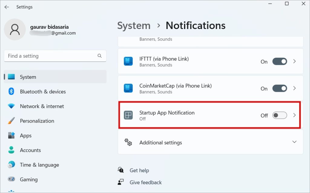 [Windows の設定] > [システム] > [通知] に戻り、[スタートアップ アプリの通知] メニュー自体をクリックして開きます。