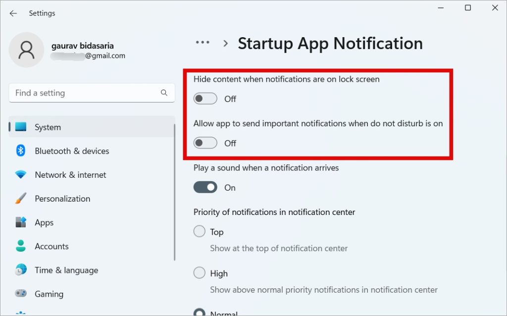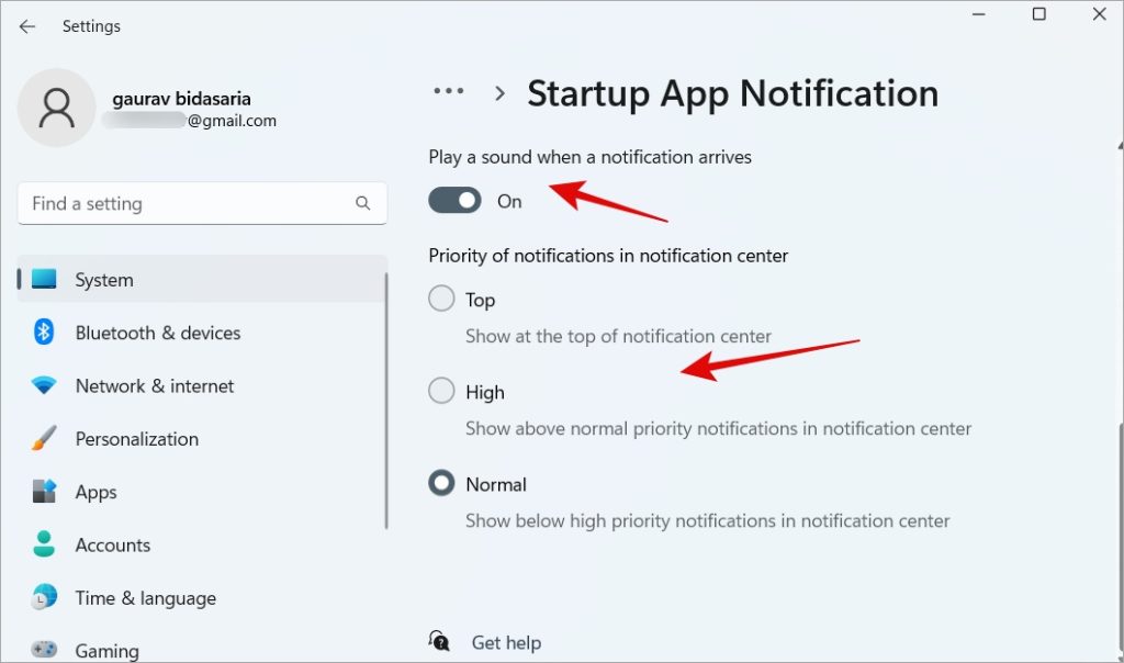 最後に、スタートアップ アプリ リストの通知が届いたときに音を鳴らすように選択し、問題の通知の優先度を設定することもできます。