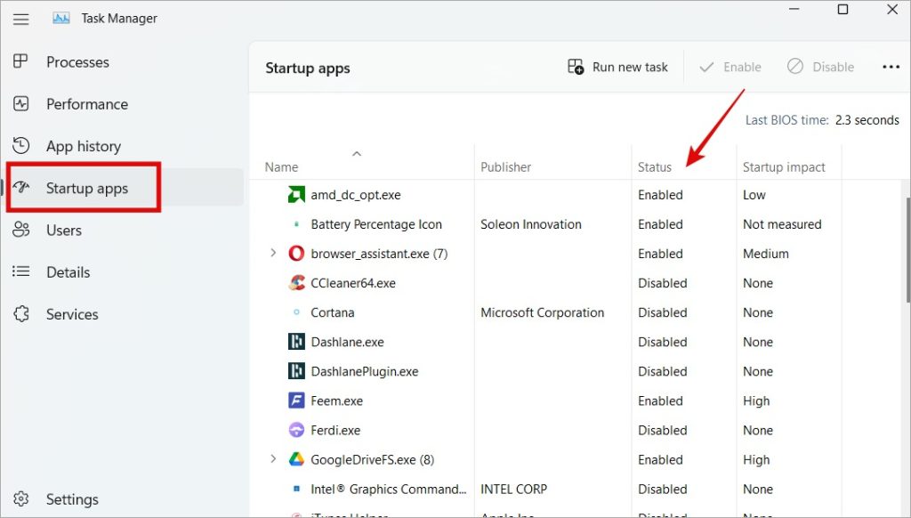 2. [ステータス] 列で、アプリが起動時に起動するように設定されているかどうかを確認できます。アプリを選択して右クリックし、[無効にする] を選択してスタートアップ アプリの起動をオフにします。