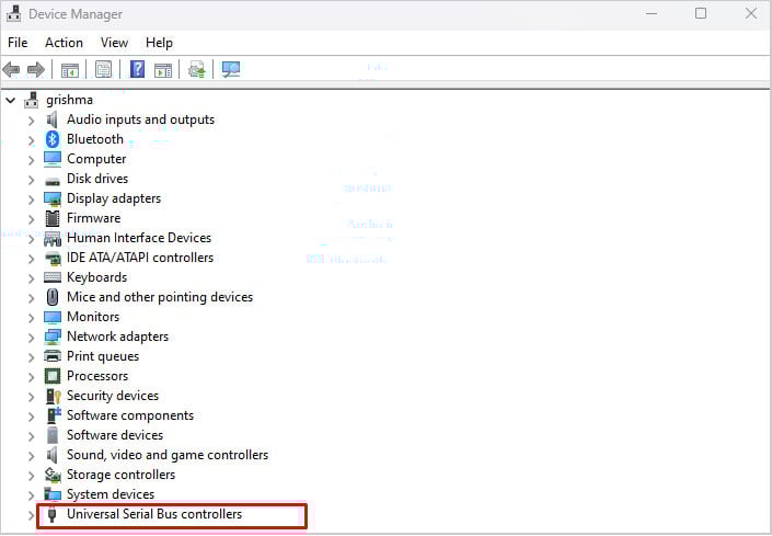 開く デバイス マネージャを検索バーで検索します。デバイスのリストから、ユニバーサル シリアル バス コントローラを探して選択します。