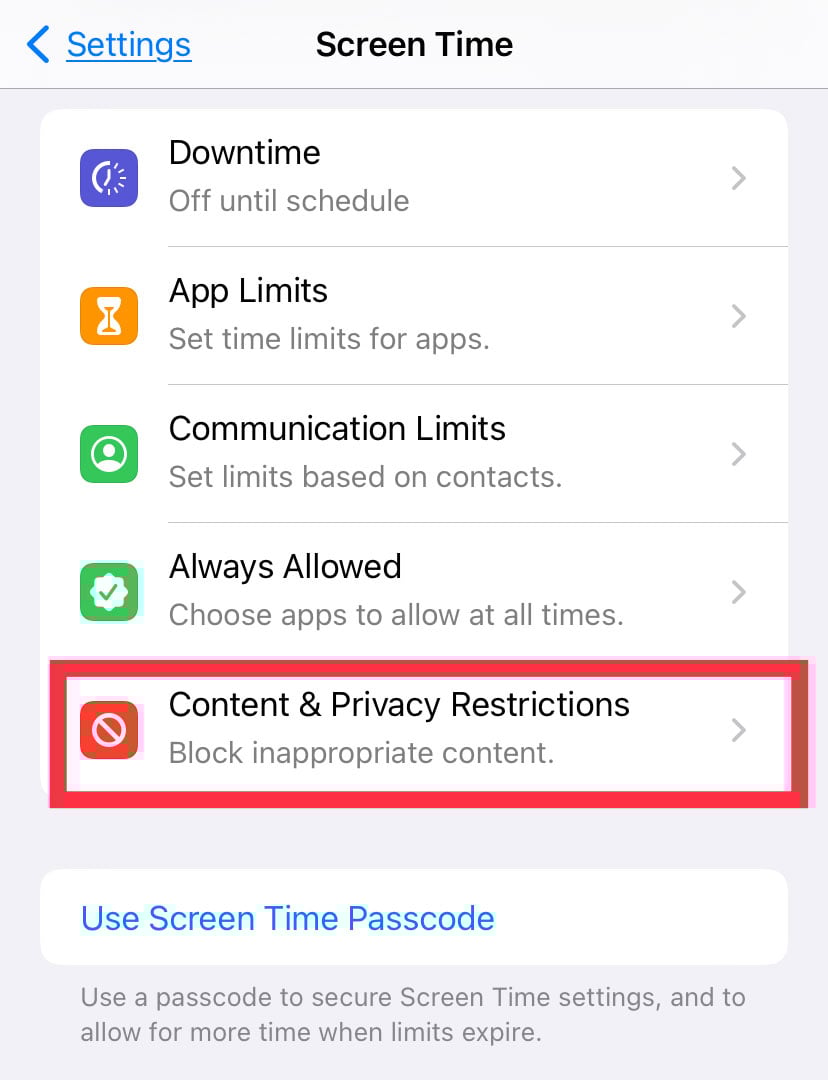 携帯電話で 設定 を開きます。 [スクリーン タイム] に移動し、[コンテンツとプライバシーの制限] を選択します。