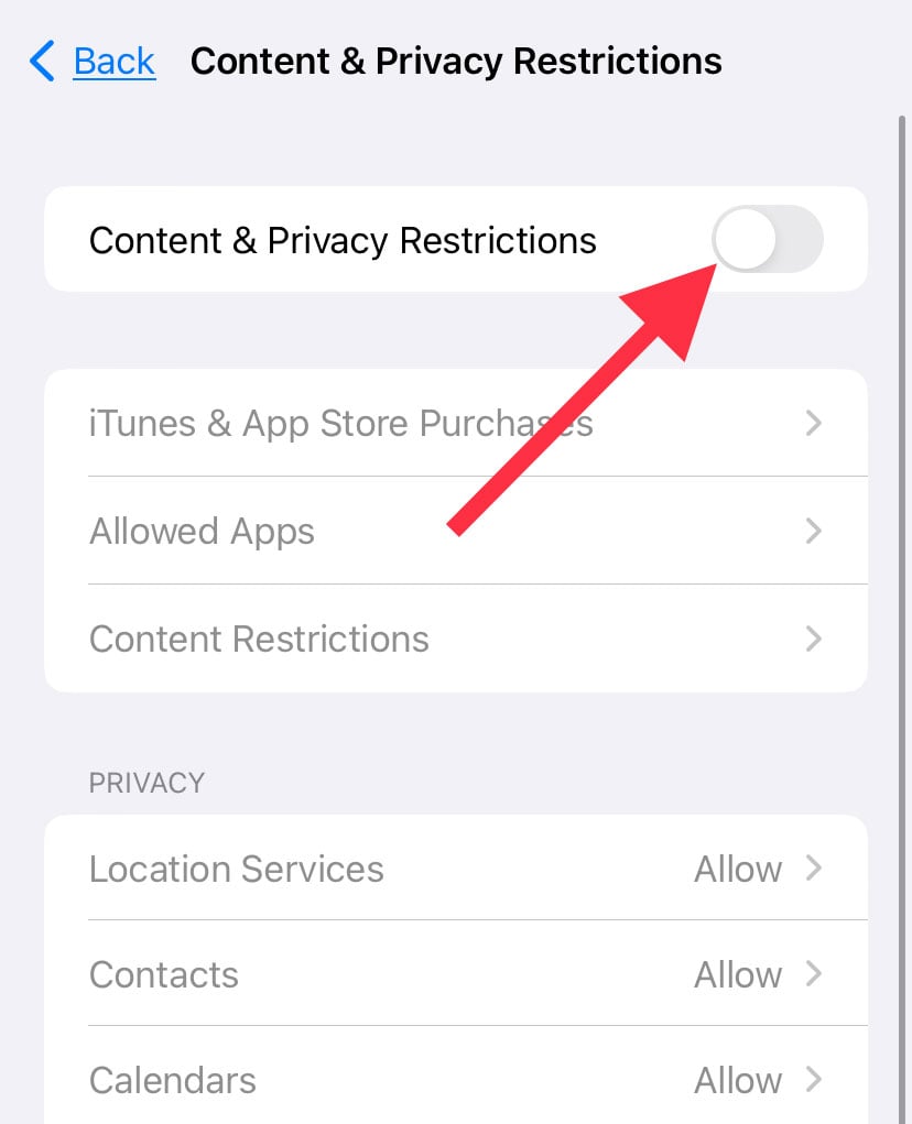 この特定の iTunes エラーを修正する別の方法は、iPhone の制限を無効にすることです。特に、コンテンツとプライバシーの制限などの設定により、iTunes に接続しているにもかかわらず、iPhone をロックしたままにすることができます。