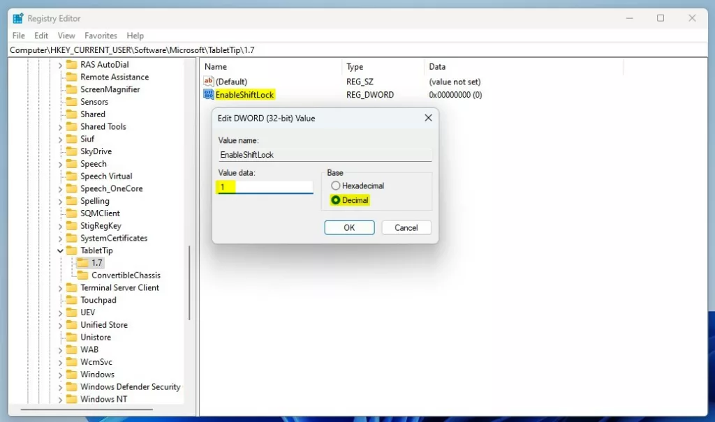 新しい値の名前 (EnableShiftLock) をダブルクリックし、値のデータ を入力します。 1 として、Windows 11 のタッチ キーボードの Shift Lock をオンにします。