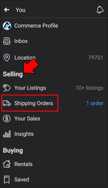 「販売」の見出しを見つけます。その下にある「配送注文」を押してください。 08/shipping-1.png?resize=350%2C610&ssl=1″>ここにアクティブな注文が表示されます。配送ラベルを作成する注文を選択してください。