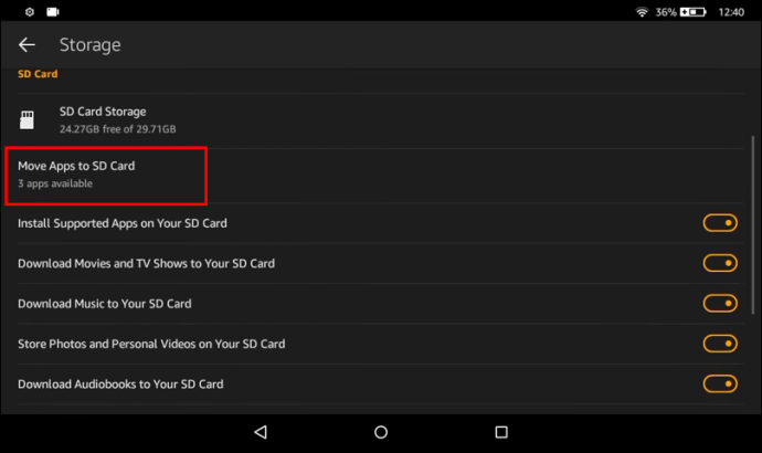 この時点で、Fire OS はすぐにカードに転送できるアプリを評価します。カードはタブレットの内蔵ストレージに残ります。