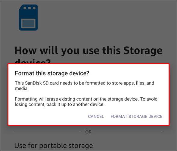 この時点で、デバイスをフォーマットするかどうかを尋ねるメッセージが表示されます。フォーマットするには、画面の指示に従います。これはスキップできます。保持したいファイルがカードに含まれている場合は、手順を実行します。