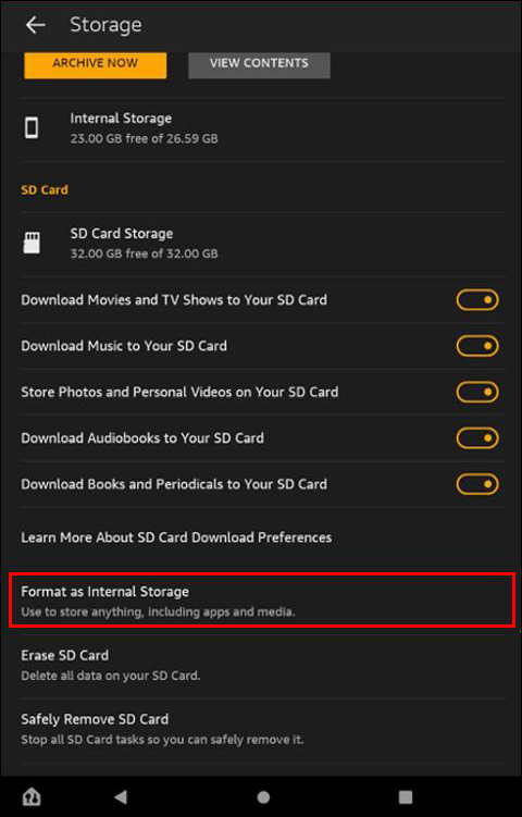 「SD」までスクロールしますカード ストレージ」を選択し、「内部ストレージとしてフォーマット」をタップします。