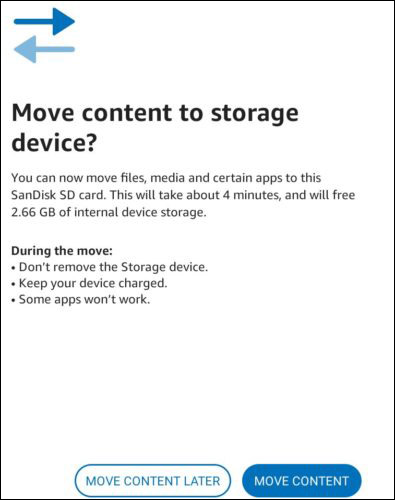 「コンテンツの移動」を選択すると、音楽、映画、ビデオなどのメディア ファイルがすぐにカードに転送されます。ただし、アプリは移動されません。「後でコンテンツを移動する」を選択すると、いつでもファイルを移動できますが、このオプションの追加の利点は、ファイルとアプリの両方を移動できることです。