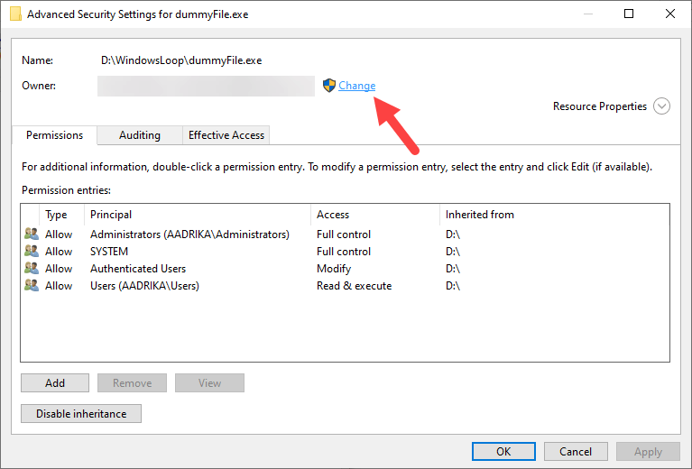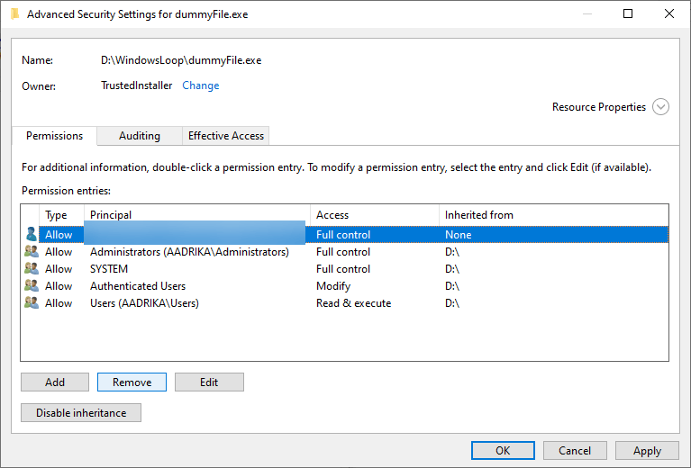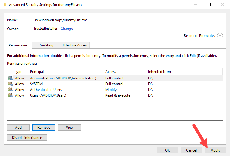 変更はすぐに高度なセキュリティ設定ウィンドウに反映されます。つまり、ファイルの所有者が「TrustedInstaller」に変更されます。