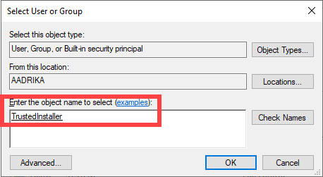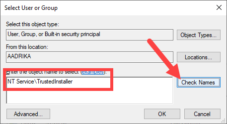 上記のアクションにより、TrustedInstaller オブジェクト名がフィールドに追加されます。 [OK] ボタンをクリックしてユーザーを確認します。