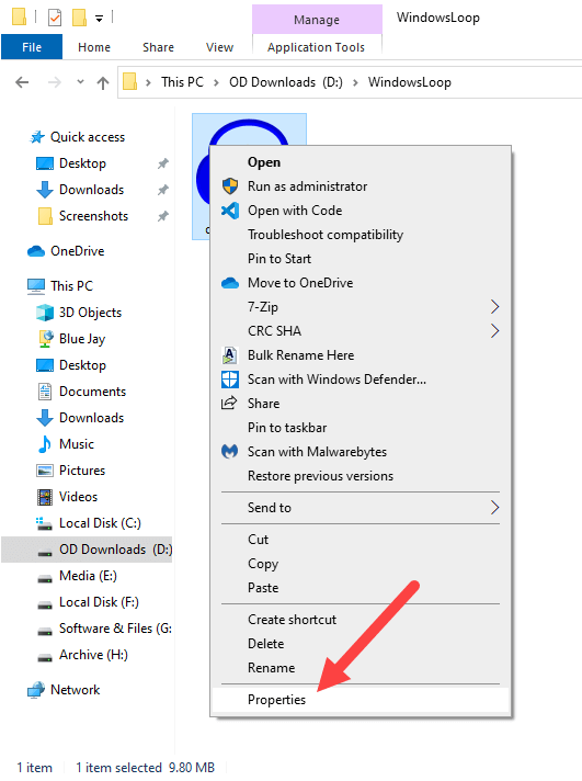 まず、所有者が変更されたファイルまたはフォルダー。私の場合、それは実行可能ファイルです。ファイルを見つけたら、右クリックして [プロパティ] を選択します。