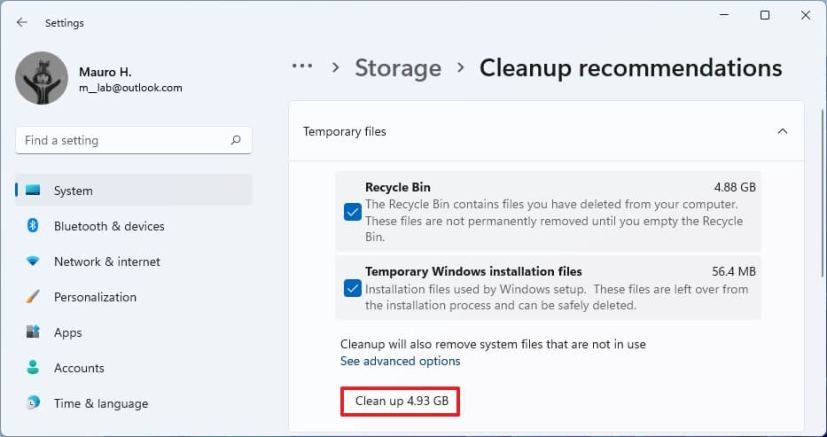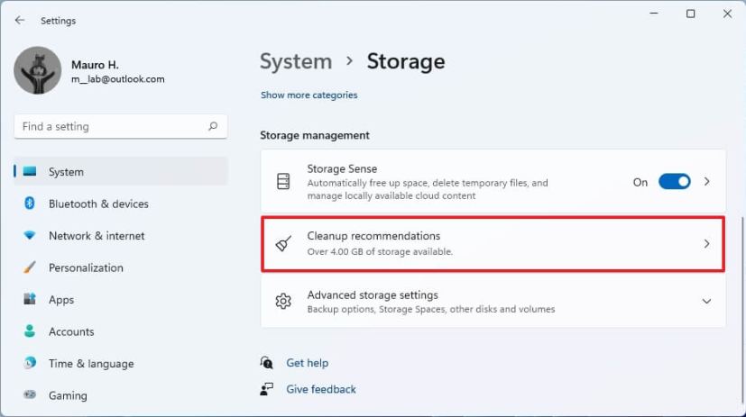 [ストレージ管理] セクションで、[クリーンアップの推奨事項] オプションをクリックします。