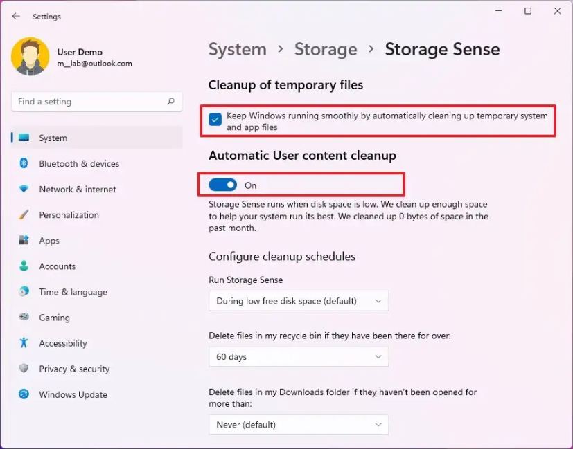手順を完了すると、Windows 11 によって空き領域が解放され、他のファイルを保存するためのスペースが確保されます。 。また、この機能を有効にしているため、使用可能なドライブ容量が少ないときにストレージ センサーが自動的に実行されます。