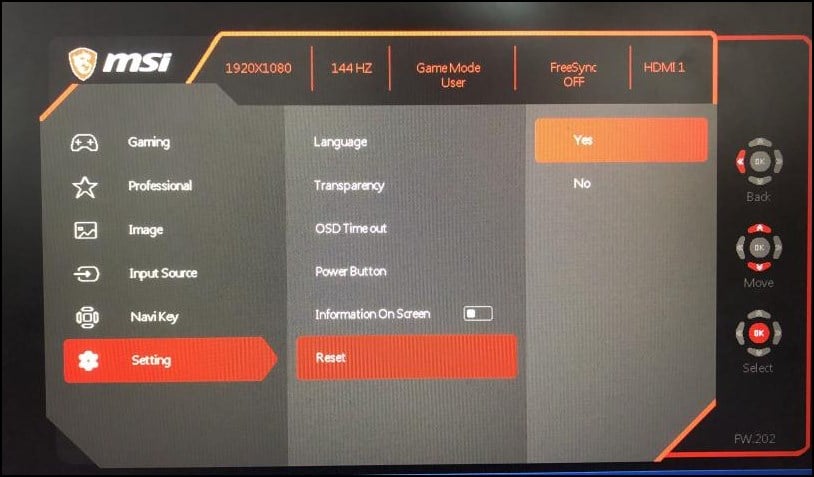 モニター設定を頻繁に切り替える習慣がある場合、これがこのような表示の問題の原因である可能性があります。ディスプレイ設定が誤って構成され、システムと互換性がなくなる可能性があります。モニターの設定を工場出荷時のデフォルトに戻すと、この問題を解決するのに役立ちます。